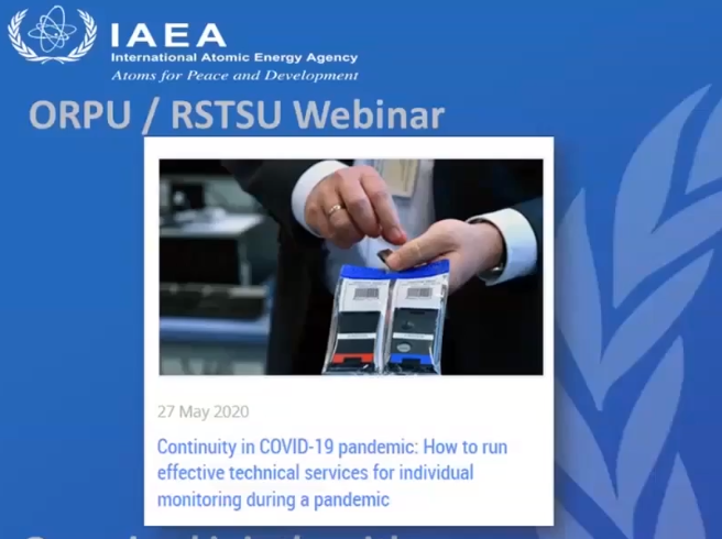 27 травня 2020 відбувся вебінар «Як забезпечити роботу служб індивідуального моніторингу під час пандемії». Експерти МАГАТЕ, спеціалісти з Бельгії та Греції обговорили існуючі та нові рекомендації для постачальників технічних послуг під час поточної пандемії. За даними організаторів, взяли участь 487 осіб, у тому числі 12 - з  України.