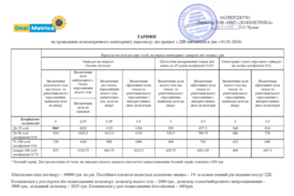 Повідомляємо діючим та потенційним замовникам індивідуального дозиметричного контролю професійного опромінення про осучаснення тарифів на послуги ІДК з метою корекції впливу інфляційних процесів в Україні. Ми інформували раніше про рішення НВП ДОЗИМЕТРИКА проводити щороку в жовтні корекцію тарифів на наступний рік з урахуванням індексу інфляції за попередні 12 місяців (по вересень включно).